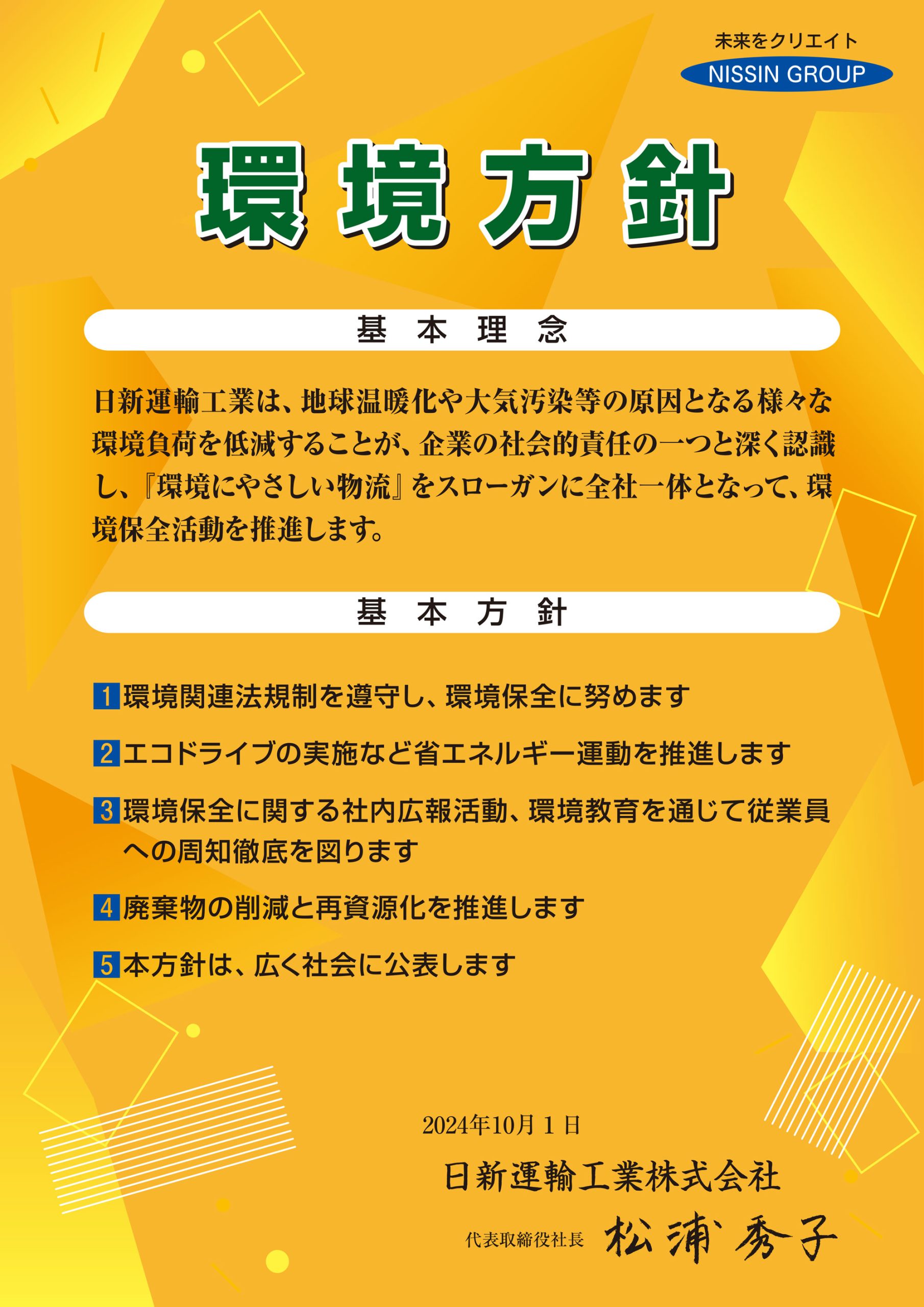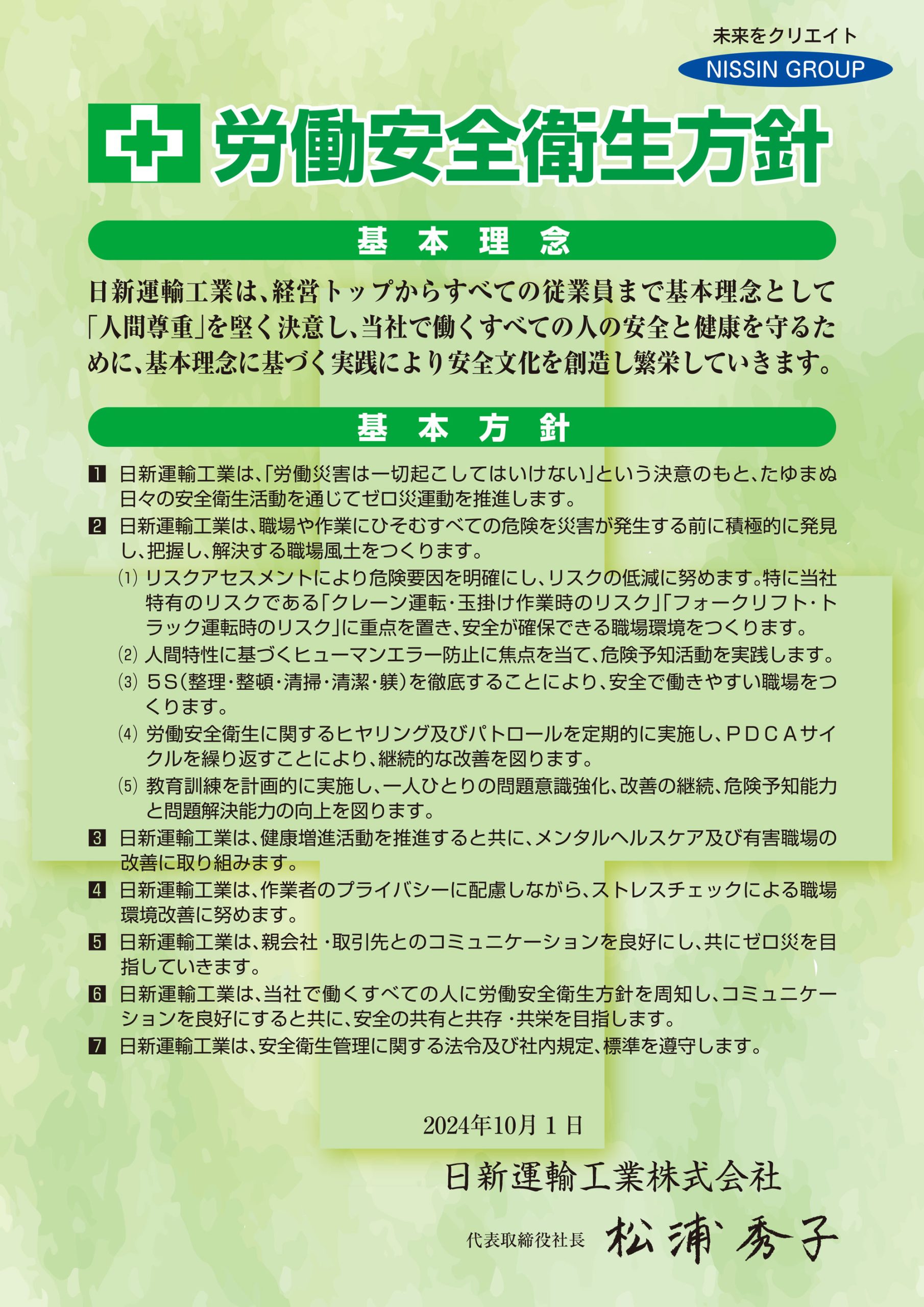6 日新運輸工業は、当社で働くすべての人に労働安全衛生方針を周知し、コミュニケーションを良好にすると共に、安全の共有と共存・共栄を目指します。