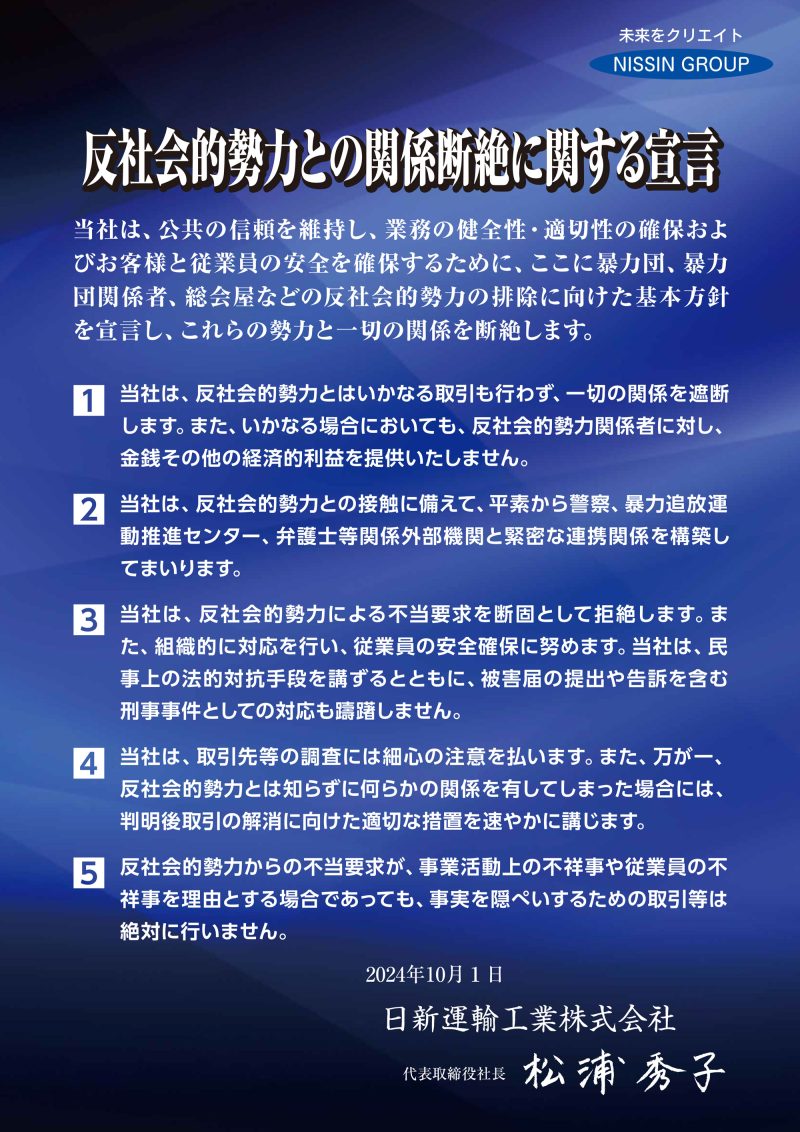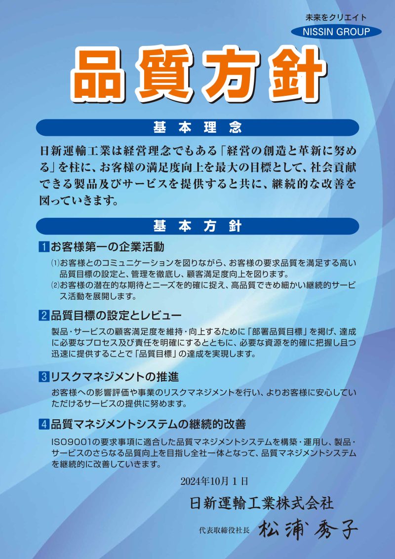 日新運輸工業は経営理念でもある「経営の創造と革新に努める」を柱に、お客様の満足度向上を最大の目標として、社会貢献できる製品及びサービスを提供すると共に、継続的な改善を図っていきます。